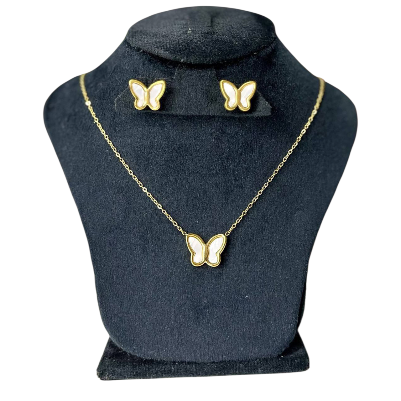 طقم أنيق مكون من سلسلة وحلق بتصميم فراشة باللون الأبيض مع لمسة جولد جذابة.